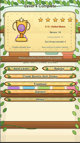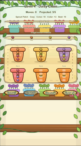 Sort colorful seeds into matching flower pots across a growing set of cozy puzzle levels. Tap one pot to pick up the top seed, then tap another pot to place it. Seeds can only move into an empty pot or onto a matching seed, so every level becomes a gentle little planning puzzle.